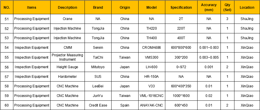 TESM have all kind of mold processing equipments, such as CNC milling machine, EDM machine, wire EDM machine, milling machine, drilling machine, grinder, lathe and so on, our main equipments as shown in the following equipment list.
